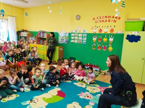 7.12.2022 – w środę – w przedszkolu gościliśmy Panią Policjant – młodszą aspirant Martę Jeger – Kęsek. Pani aspirant była pod dużym wrażeniem wiedzy, którą posiadają dzieci na temat bezpieczeństwa na drodze, w przedszkolu i domu. Wspólnie przypomnieliśmy sobie zasady/przepisy ruchu drogowego obowiązujące na drodze, omówiliśmy w jaki sposób należy zachowywać się w domu i w przedszkolu, by czuć się bezpiecznym Serdecznie dziękujemy Pani Policjant za cenne rady, uwagi, ze kolejną lekcję o bezpieczeństwie.
